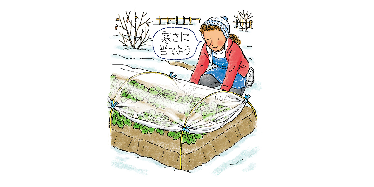 A. ホウレンソウ、コマツナ、タアサイなどの野菜は、寒さや霜に当てる「寒じめ」をすると甘味が増しておいしくなります。寒じめの方法は簡単で、12~2月の厳寒期に収穫間近のコマツナなどの霜よけ用の裾(トンネルのビニールなど)を上げて寒さにさらすだけ。2~3週間を目安に、縮み具合を見て収穫します。葉が縮んだ「ちぢみコマツナ」など寒じめ用の品種もあります。