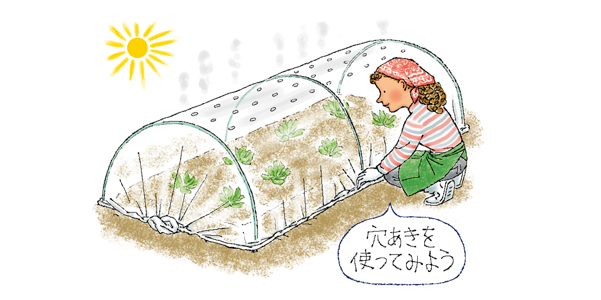 A. トンネル用のシートには、換気用の穴があるものとないものがあります。さらに不織布や防虫ネットなども含めるとさまざまな種類があり、機能や目的によって使い分けることが大切です。毎日菜園に行けない場合は、穴あきのトンネル用シートの内側に不織布をベタがけするのもひとつの方法です。
