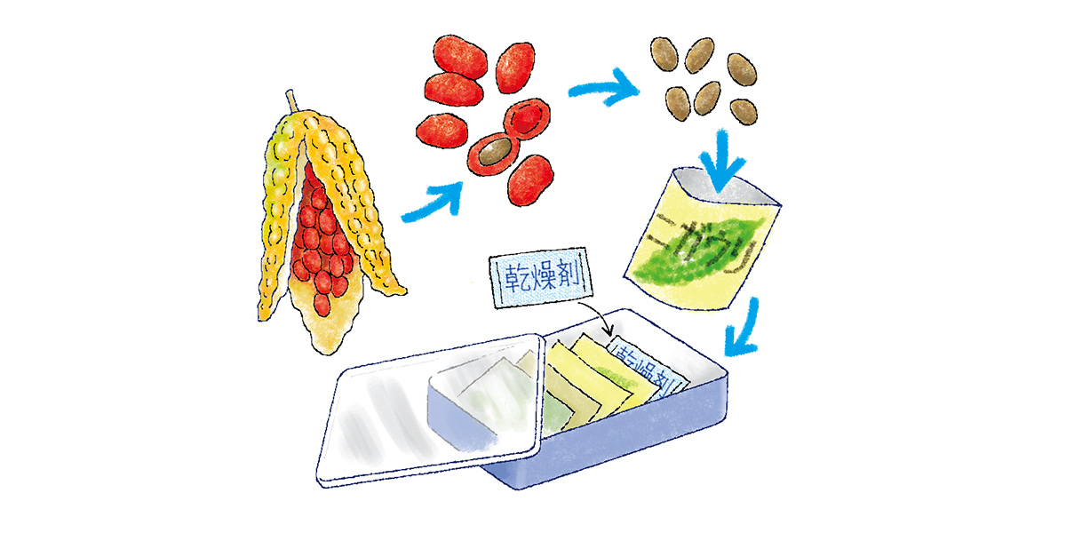 A. 伝統的な品種の場合は自家採取できます。ニガウリを実が黄色くなるまで完熟させると、中に赤いゼリー状のものに包まれたたねができます。たねだけを取り出し、きれいに洗って日陰でしっかり乾燥させます。封筒などに入れて乾燥剤と一緒に密閉容器に入れ、冷蔵庫で保存しましょう。