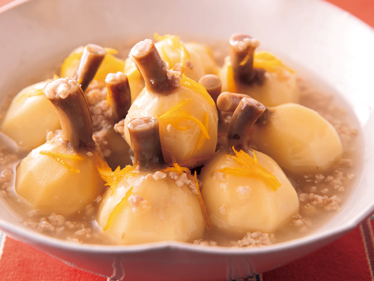 お正月料理に欠かせないくわいを、鶏ひき肉のそぼろあんでやさしい味わいに仕立てました。