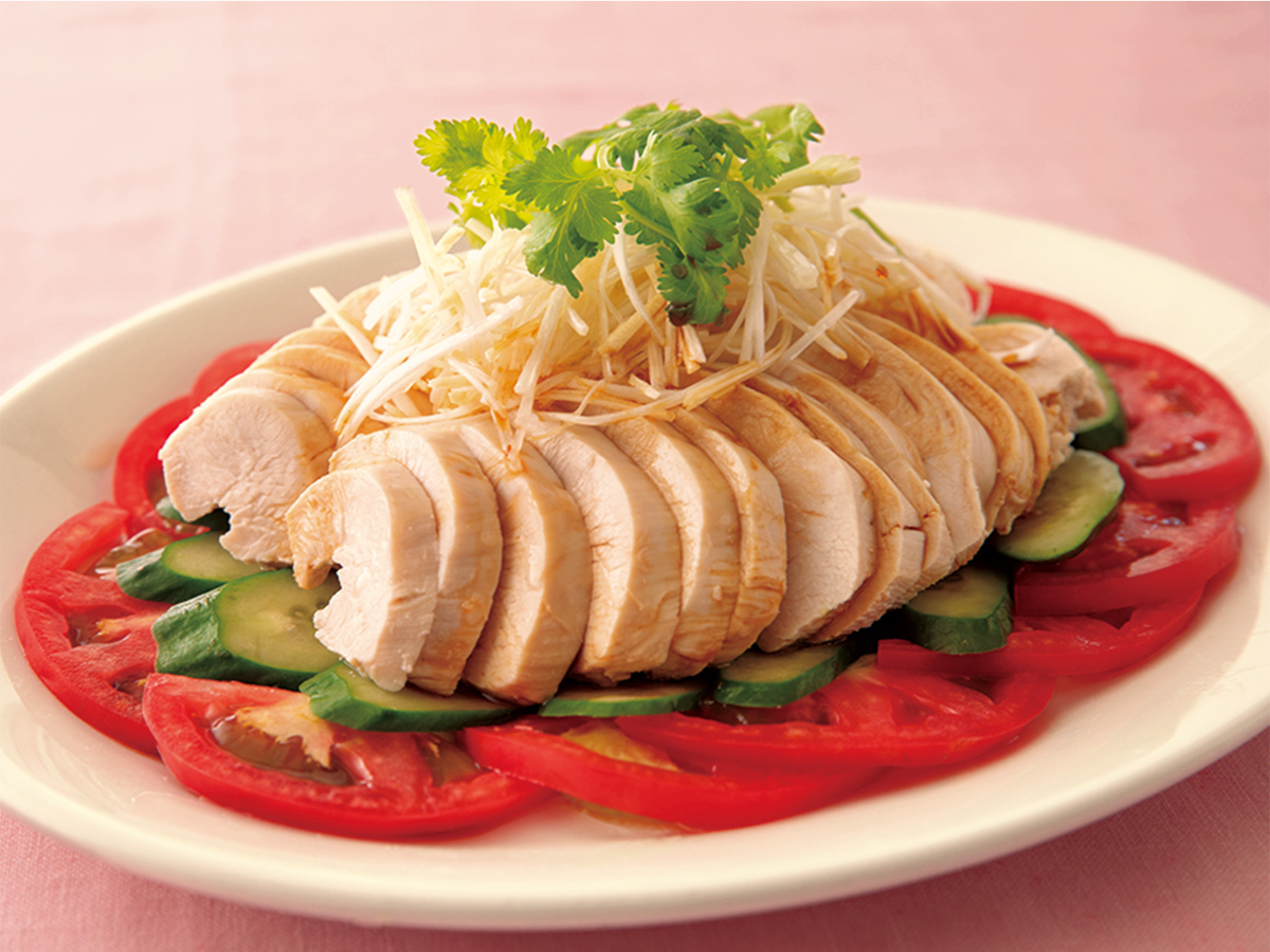 鶏肉の皮目をフォークで刺し、耐熱器に皮目を下にして入れ、酒をふって15分ほど置く。ラップをかけ電子レンジ(500w)で8~10分ほど加熱して、そのまま余熱で蒸らしてから取り出し、塩をふって冷ます。