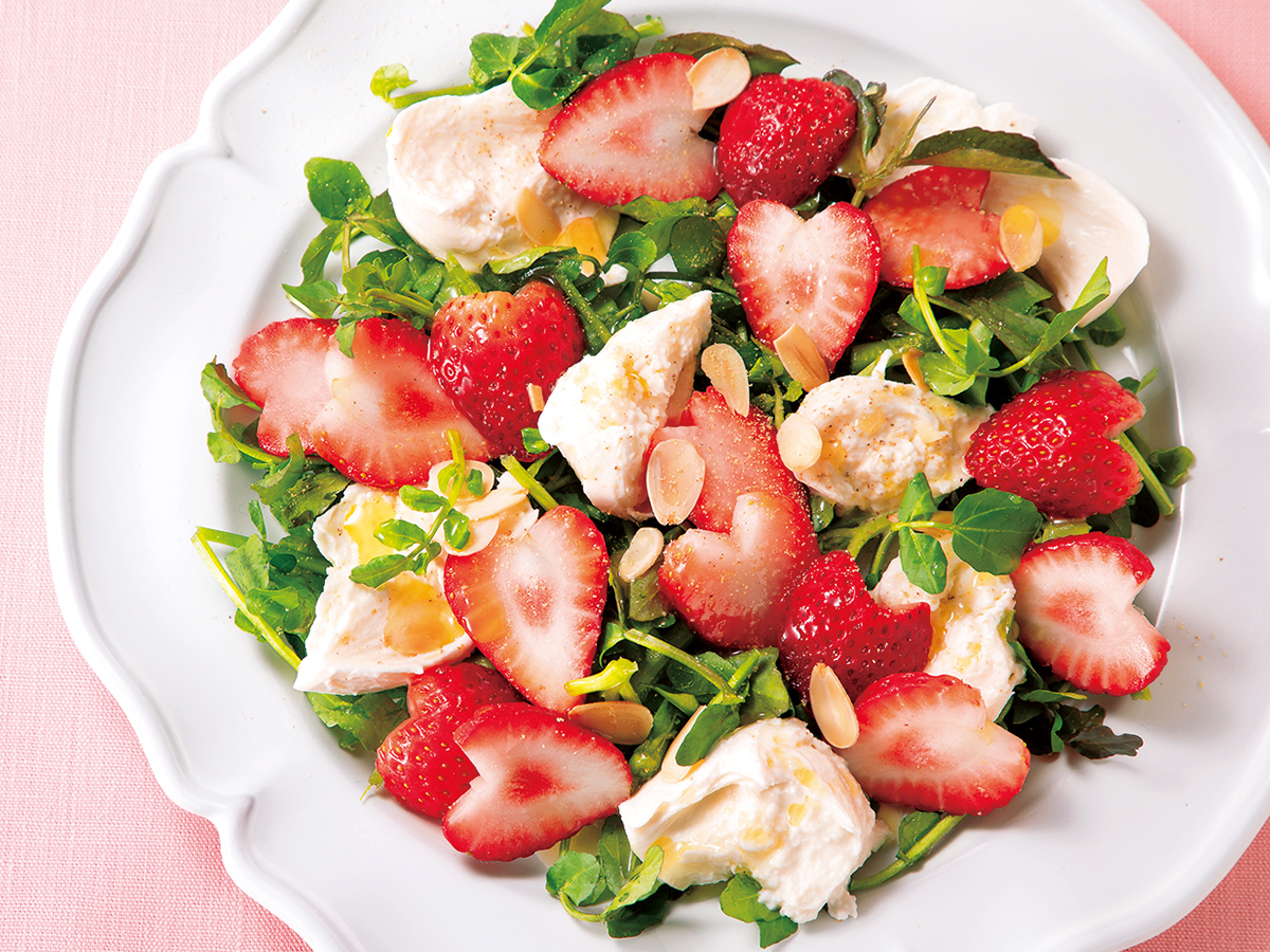 器にクレソンを広げ、モッツァレラチーズの水気を切って一口大にちぎって置き、いちごを盛り付ける。油、レモン汁、塩、こしょうを順にかけ、2を散らす。食べる直前に全体をまぜていただく。